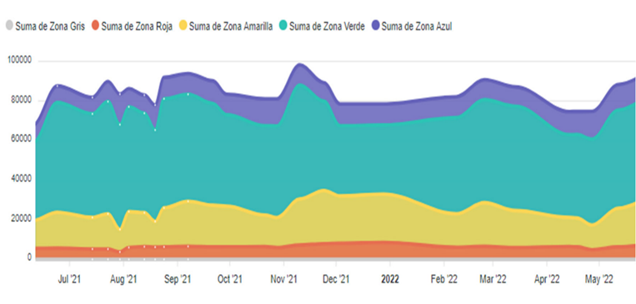 Una vez obtenido el valor del amortiguador se procedió a establecer sus zonas y los topes de la zona. La zona verde comprende la cantidad mínima de pedido y tiene como tope máximo la suma de la zona roja, amarilla y verde. La zona amarilla comprende la división del amortiguador para las 3 zonas y tiene como tope máximo la zona amarilla más la zona roja, y por último la zona roja y su tope comprende la división del amortiguador para las 3 zonas. (Figura 2).