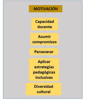 Según la figura 3 los docentes motivados muestran interés por asumir compromisos diversos, perseverar en su labor, mostrando resiliencia ante las adversidades y aplicando estrategias didácticas inclusivas para una gestión positiva en el aula.