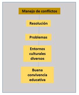 En la figura 6, se refleja el manejo de conflictos como una estrategia para la resolución de problemas en entornos culturales diversos, en función de evitar tensiones que afecten la dinámica educativa y promuevan la buena convivencia educativa.