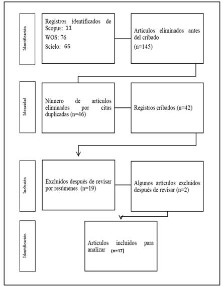 Con relación a los criterios de exclusión, se eliminaron documentos con acceso limitado, así como secciones de libros, ponencias y tesis no arbitradas, además de publicaciones anteriores a 2022. A partir de estos criterios, se obtuvo una muestra de 17 documentos: 4 de Scopus, 3 de WoS y 10 de SciELO. Los términos de búsqueda, que se muestran en la Tabla 1, delimitan con precisión el corpus documental y dirigieron la selección de los estudios que componen esta revisión.