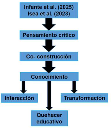 En la figura 2, autores como Infante et al. (2025) manifiestan que el pensamiento crítico fomenta la co-construcción del conocimiento y la interacción. Para Isea et al. (2023), la universidad contribuye con el quehacer educativo, generando transformaciones.
