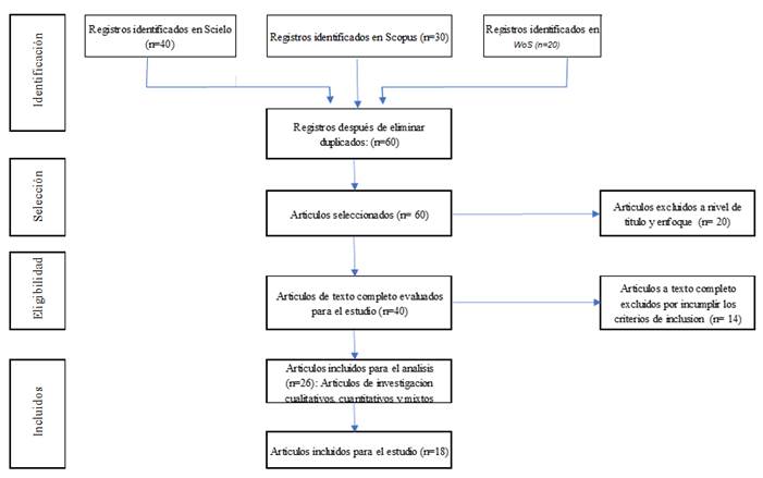 La metodología empleada se basó en un enfoque cualitativo mediante un tipo de investigación documental, cuyas técnicas empleadas fueron la revisión sistemática y el análisis de contenido. Como instrumentos, se emplearon las fichas de registro y las matrices de análisis. También, se empleó la declaración PRISMA, la cual permitió la consideración de artículos derivados de bases de datos como Scopus, Scielo y Web of Science. De igual manera, se tomaron en cuentas los siguientes criterios de inclusión: