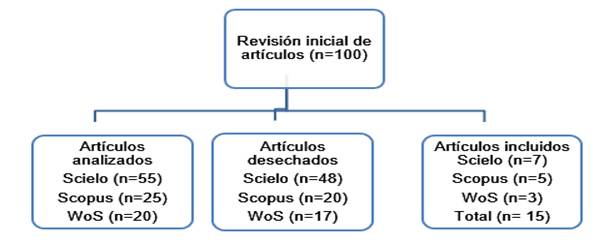 Tal como lo muestra la figura 1, se obtuvieron 100 artículos (55 de Scielo, 25 de Scopus y 20 de WoS), de los cuales, al revisar el contenido, se desecharon 48 de Scielo, 20 de Scopus y 17 de WoS, teniendo como resultado un total de 15 artículos científicos aprobados; es decir, 7 de Scielo, 5 de Scopus y 3 de WoS.
