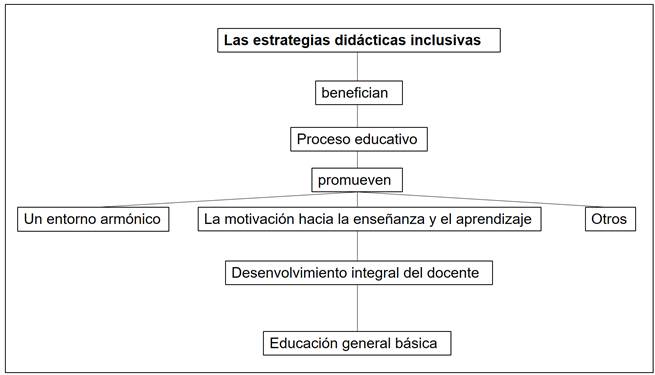 En síntesis, según la figura 2, las estrategias didácticas inclusivas benefician el proceso educativo, por cuanto promueven una acción equitativa, un entorno armónico, la motivación hacia la enseñanza y el aprendizaje, entre otros aspectos clave para el desenvolvimiento integral del docente encargado de la educación general básica.